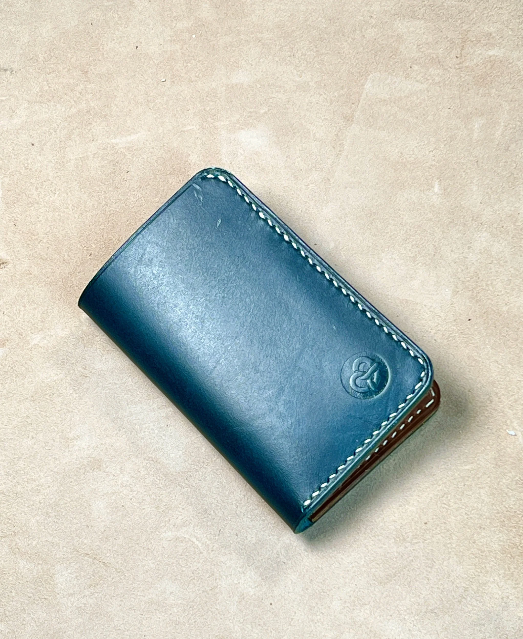 Our compact, folding card holder design with four pockets and two accessory flaps, keeps plenty on hand wherever you need it! This piece’s exterior is Museum Buttero in blue and the inside features a brown Cordovan Calflskin interior. Saddle stitched by hand with japanese Vinymo thread.